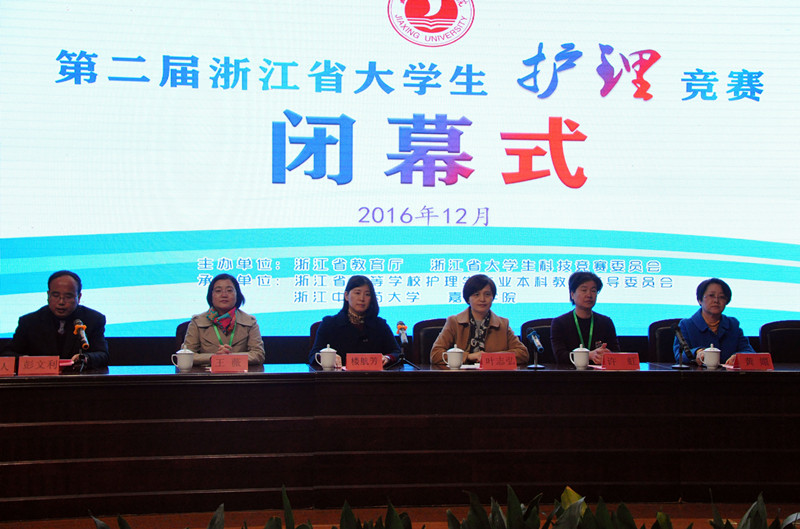 2016年12月10日到11日,第二届浙江省大学生护理竞赛在嘉兴学院举行。浙江省教育厅高教处副处长王国银,浙江省大学生护理竞赛委员会主任委员、浙江中医药大学党委书记孙秋华,嘉兴学院党委书记黄文秀等嘉宾和专家委员,以及各参赛队伍师生出席了10日的开幕式。本次竞赛决赛共有来自全省16所本科护理院校31支队伍参赛。经过两天激烈比赛,共产生5个团体一等奖,获奖团队分别为浙江中医药大学当归队、浙江中医药大学三七队、浙江中医药大学滨江学院燕羽心生队、浙江中医药大学滨江学院循路队、嘉兴学院嘉医-Running Girl队。5个团体二等奖,获奖团队分别为温州医科大学冲锋战队、温州医科大学白玉兰队、温州医科大学护动青春队、温州医科大学白衣展翅队、嘉兴学院Big Bang队。10个团体三等奖,获奖团队分别为湖州师范学院Dreamer队、湖州师范学院求真学院朝阳队、绍兴文理学院元培学院Lucky Clover队、杭州师范大学医见倾心队、绍兴文理学院完美组合队、湖州师范学院求真学院卓越队、湖州师范学院飞翔队、绍兴文理学院“V”笑之队、绍兴文理学院元培学院医路有爱队、嘉兴学院南湖学院Perfect Hands队。6个组织奖,获奖团体为嘉兴学院、浙江海洋大学、浙江中医药大学、温州医科大学、绍兴文理学院、湖州师范学院。
