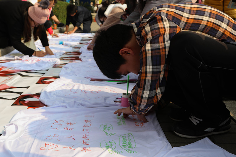 活动期间,青协工作人员引导同学们有序参与活动,呼吁大家了解艾滋病的相关知识,号召同学们学会防治艾滋病。本次活动内容丰富,形式多样,分为许愿墙、绘画白色T恤衫、香蕉试验方阵三个部分。许愿墙上写满了同学们心中的寄语;白色T恤衫上绘画着各种各样与主题相关的图案;更有志愿者排成形似红丝带的方阵,用香蕉试验来模拟如何正确使用避孕套。