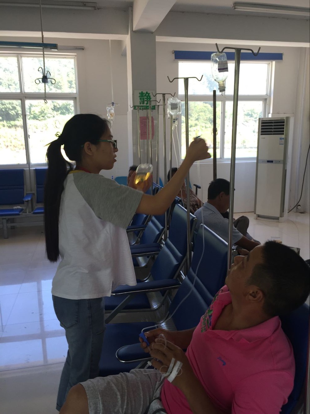 2016年7月7日,嘉兴学院彩票平台 丽水防艾队成员们来到了丽水市遂昌县金竹镇的中心卫生院辅助输液大厅的护士们工作。