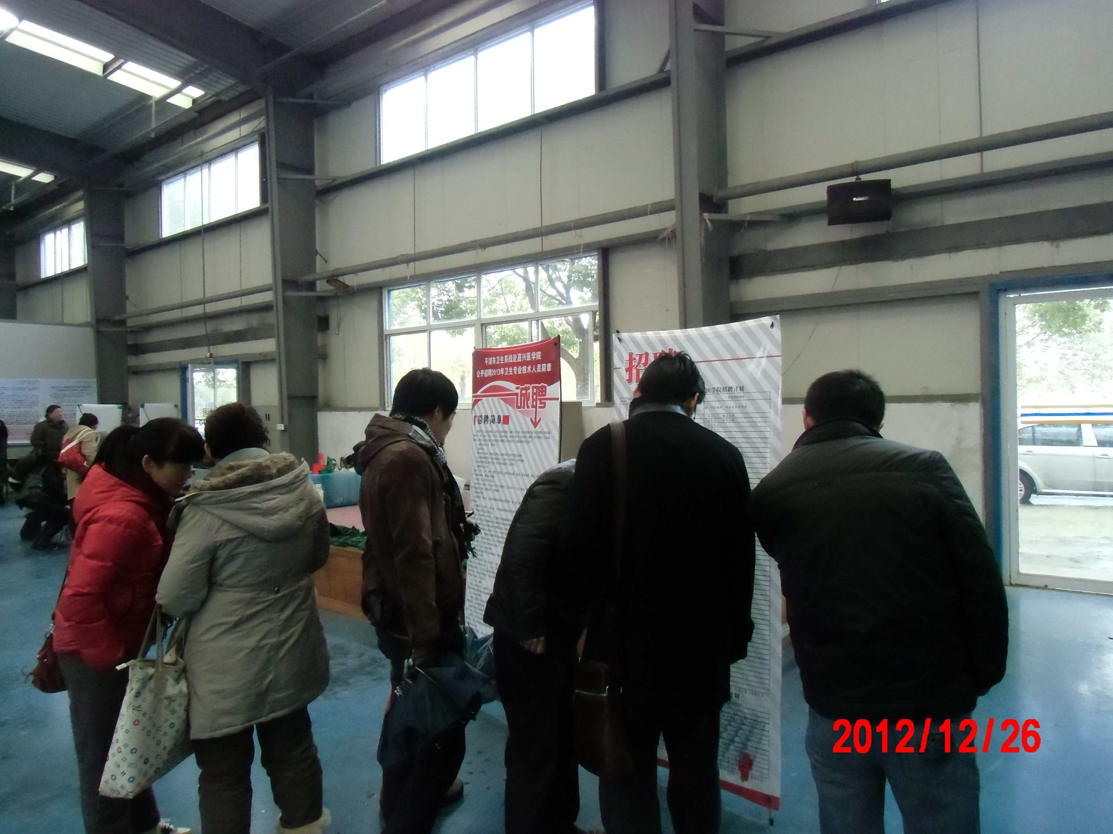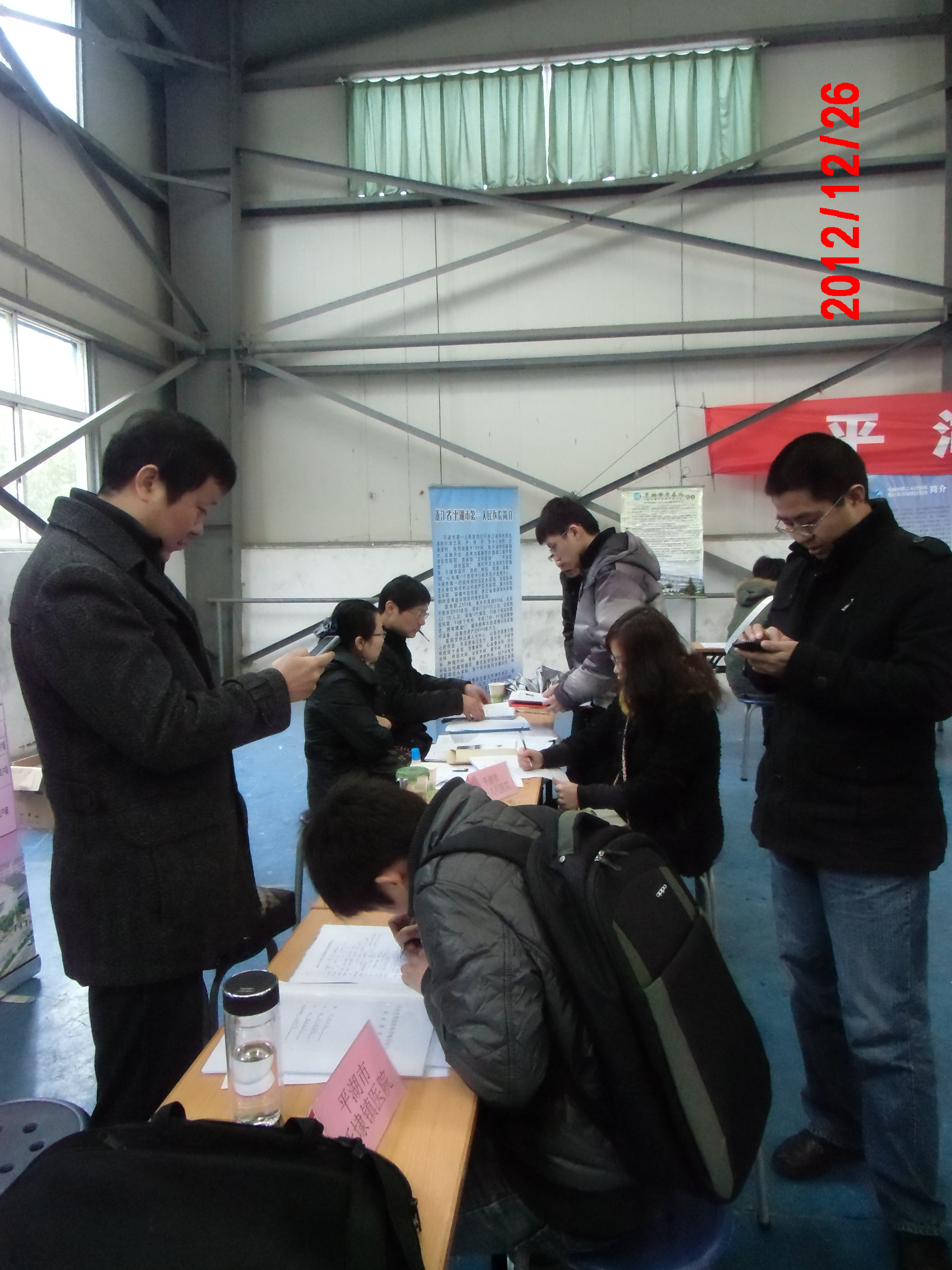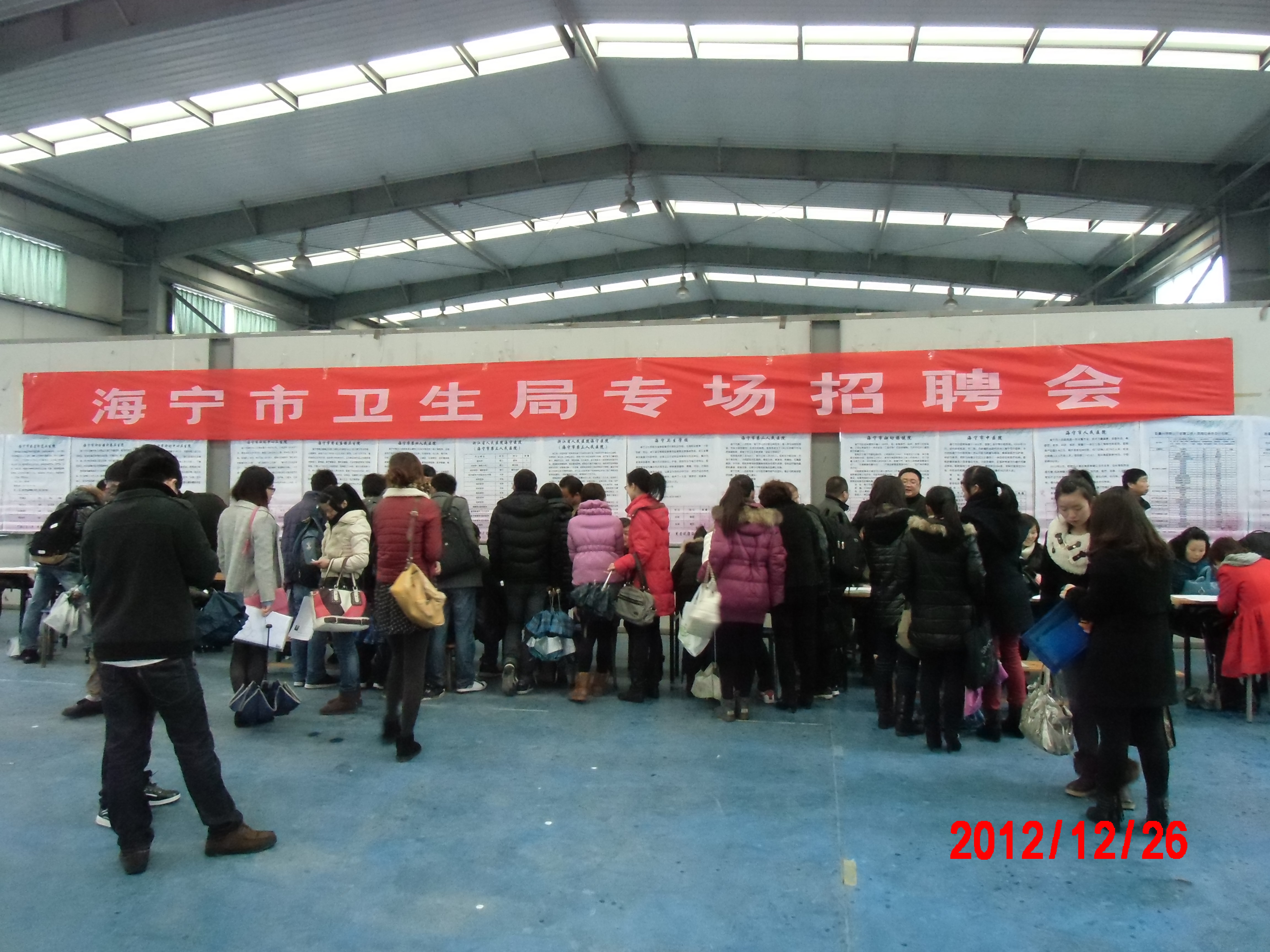 在学校、学院领导的高度重视和大力支持下,2012年12月26日,彩票平台 在梁林校区风雨操场成功举办了“2013年海宁、平湖卫生局专场招聘会”。这是我院第6次与海宁市卫生局、人事局合作,首次与平湖市卫生局、人事局合作举办招聘会。海宁卫生局共有人民医院、中医院、周王庙镇卫生院等13家用人单位,提供岗位111个;平湖卫生局共有人民医院、中医院、新埭镇医院等15家用人单位,提供岗位131个。参加本次招聘会人数约100余人。