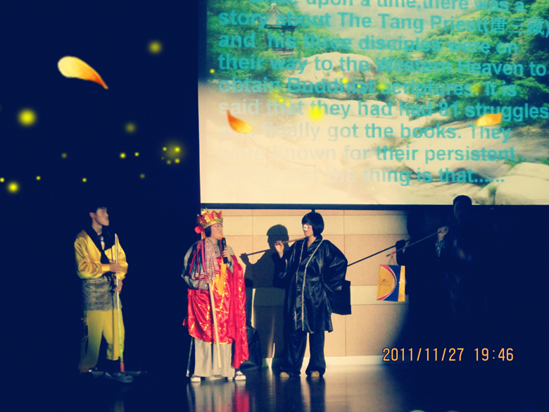 乐队带来的活力四射的《王妃》开始,铿锵有力的节奏带动了全场观众的热情,在充满异域风情的印度舞表演之后,大屏幕上依次播放了获得本届“优秀社团”称号的笛箫协会、街舞协会、吉他协会和荧光爱心社的精彩视频。一场别开生面使人捧腹大笑的英语话剧《三打白骨精》更是让晚会达到了一个高潮,精彩的演出之后再次揭晓了“最佳社长风采奖”的获得者——国标协会会长孙源和女生会馆会长林晓东。