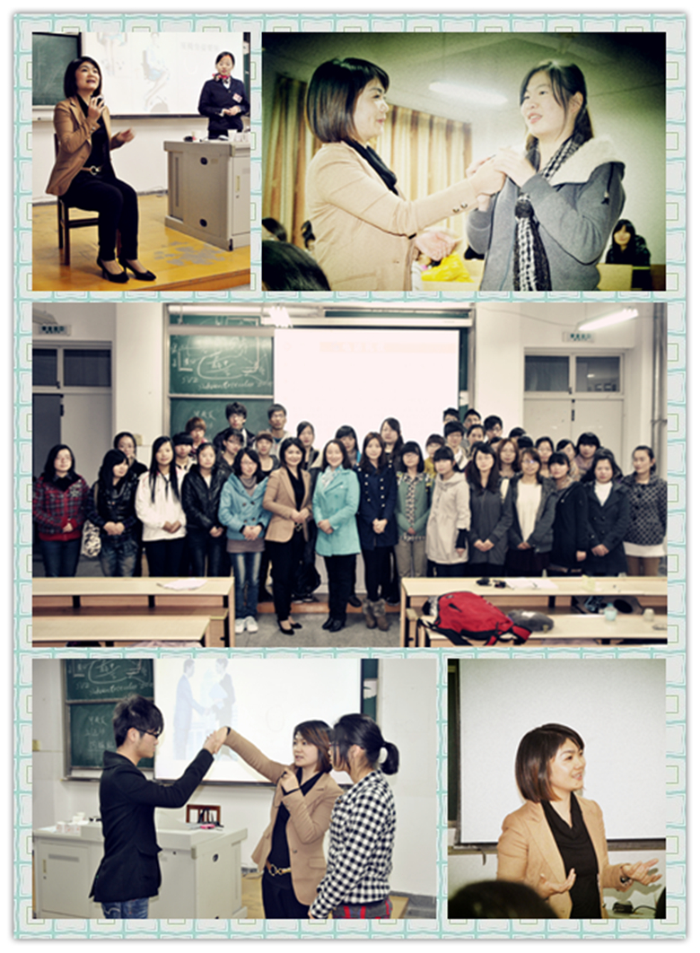 接下来吴烂漫女士以幽默风趣的语言和生动翔实的实例,带领同学们一起学习微笑的技巧、站姿、坐姿、引导礼仪、握手礼仪、物品递交礼仪等,整个教室充满了欢声笑语,于潜移默化中也感觉到自己气质的改变,最后讲座在团总支江欢老师的总结下落下帷幕。
