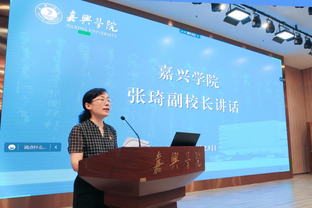 张琦副校长致辞,她表示,多年来嘉兴学院充分发挥在中国革命红船起航地办学的政治优势、长三角一体化发展的战略优势,大力弘扬伟大建党精神、红船精神,坚定不移走内涵发展与应用型办学之路。在省市两级党委政府与社会各界大力支持下,学校正全力以赴建设“有特色、善创新”的一流应用型综合性大学。