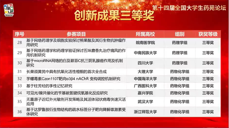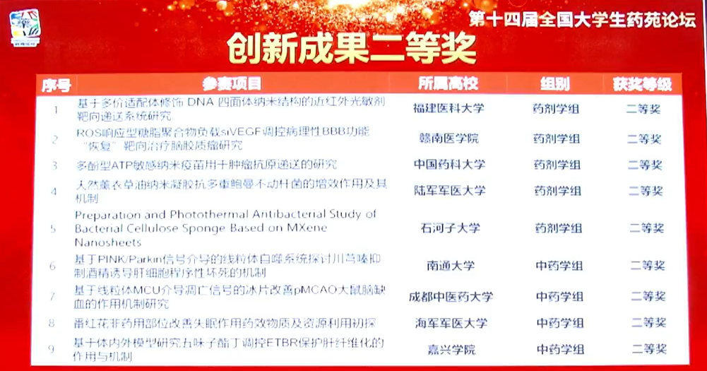 2023年3月18日,第十四届全国大学生药苑论坛在河北医科大学落下帷幕,我院药学专业本科生斩获创新成果奖两项,获奖数量再创新高。